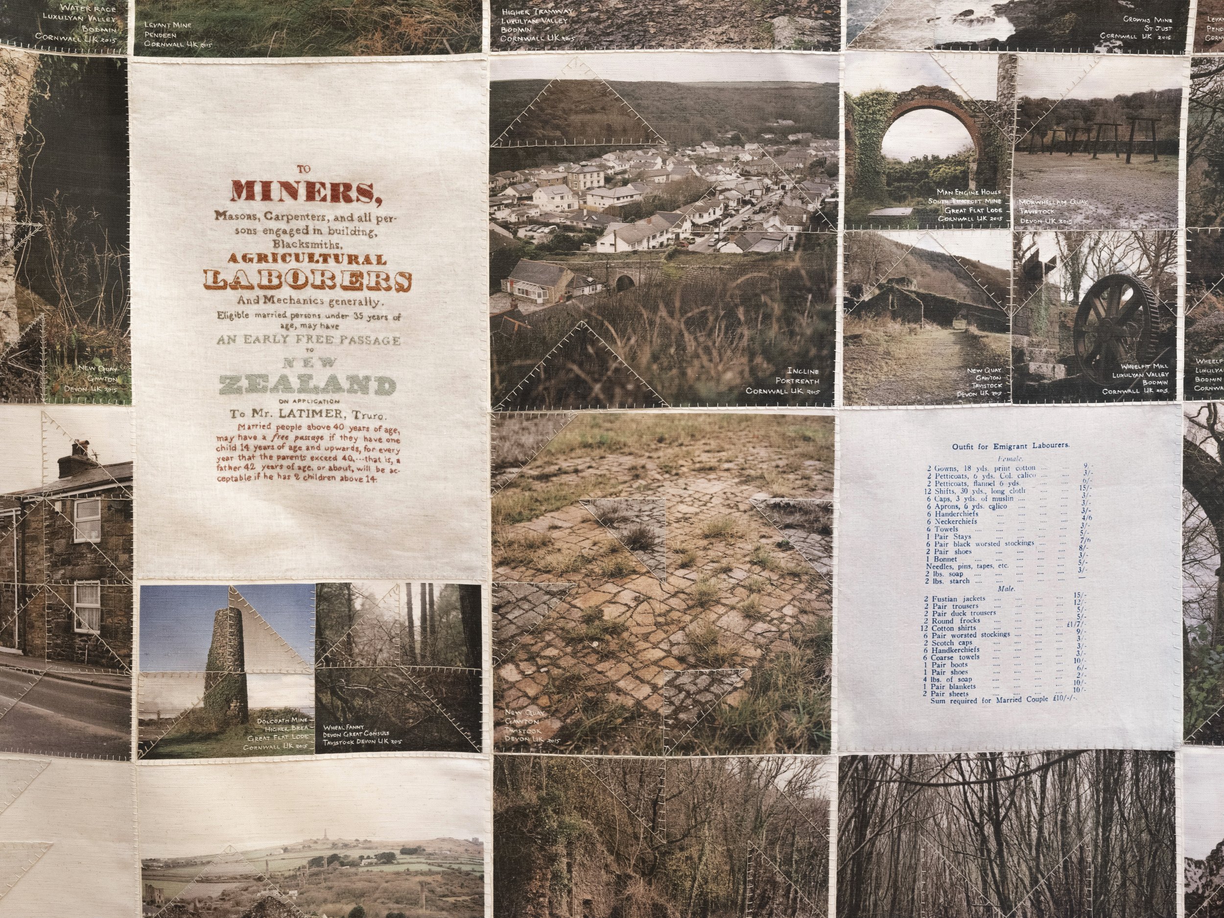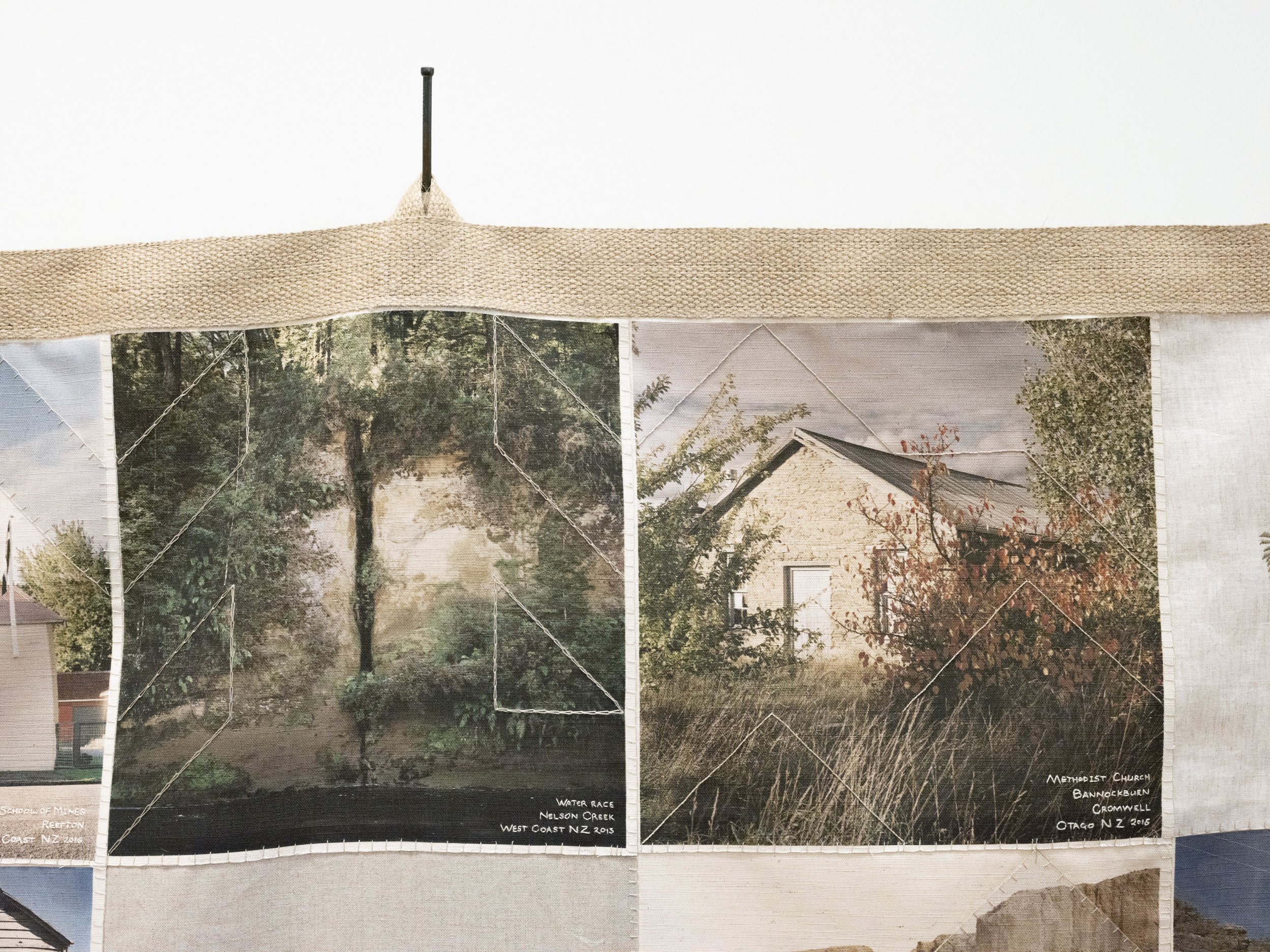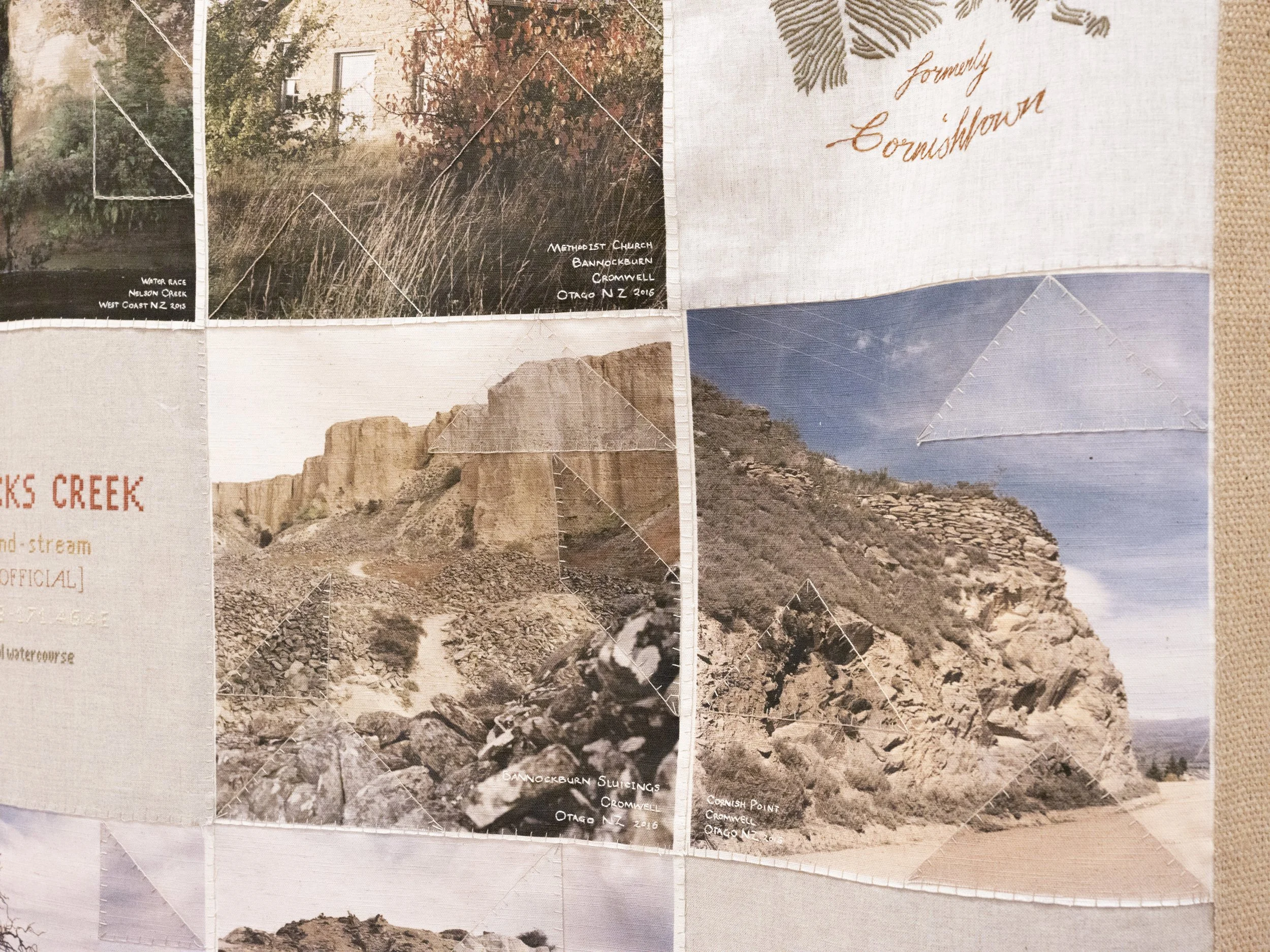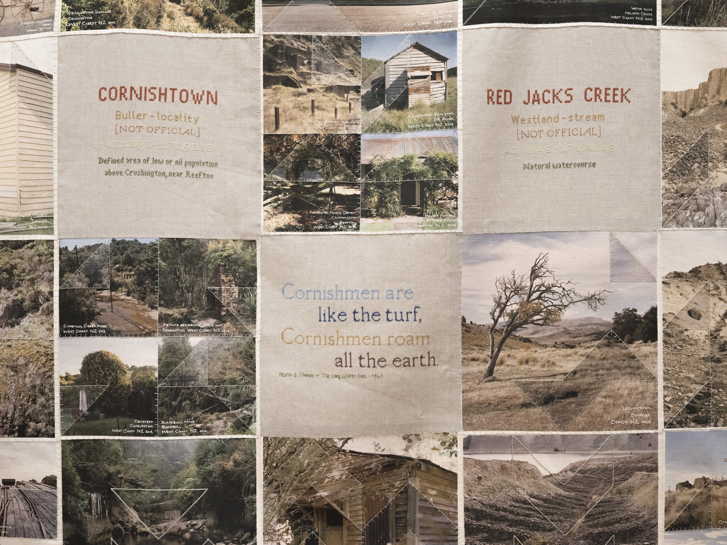 Like the Turf reveals Caroline McQuarrie’s artistic exploration of Pākehā histories of colonial settlement through the examination of a specific set of immigrants in late 19th century Aotearoa New Zealand. Skilled migrants and their families left Cornwall and Southwest Devon’s failing tin mines to join the New Zealand gold rushes or work in underground gold and coal mines. Locations in Aotearoa the miners landed stretched from Kawau Island in the Hauraki Gulf through the Coromandel, the West Coast and into Otago. Conceptually this exhibition examines intergenerational histories and sociologies. Catherine Delahunty has described the post-migratory experience as “the severing from ancestors and from the land that has brought us material advantage and spiritual emptiness. The denial of this condition assists us in our denial of the tangata whenua indigenous reality and justifies our control of resources. But it has required a weird forgetfulness.”[2] Combining photographic imagery, embroidery and textiles to contextualise the lives of these colonial-settlers, Like the Turf weaves the less visible experience of women and families with the legacy of industry left in the landscape. The imagery in Like the Turf has been made on the whenua of Ngāti Waewae, Kāti Māhaki ki Makaawhio and Kāti Huirapa ki Puketeraki (Ngāi Tahu), Ngāti Hauā (Waikato Tainui) and Ngāti Manuhiri.