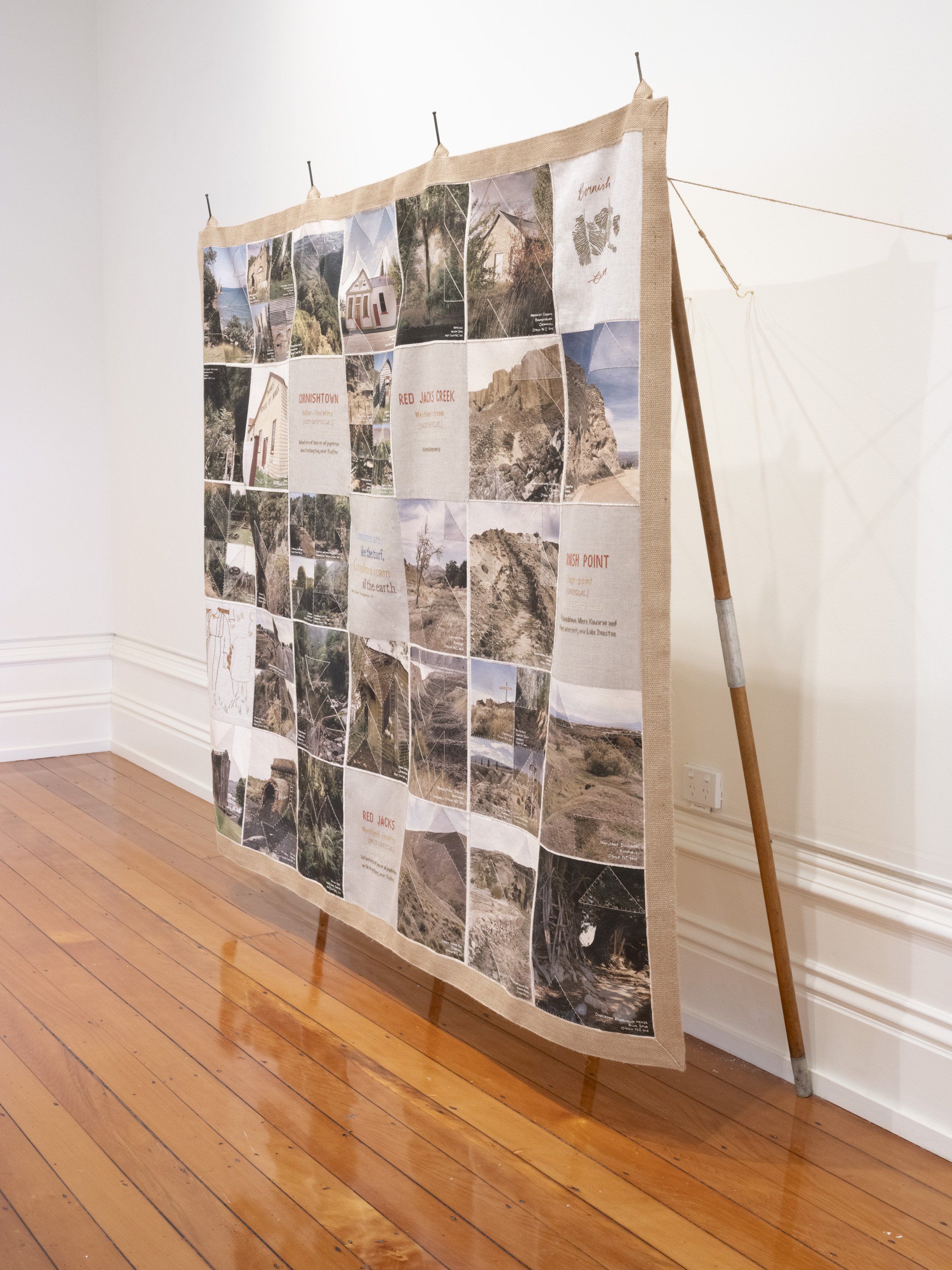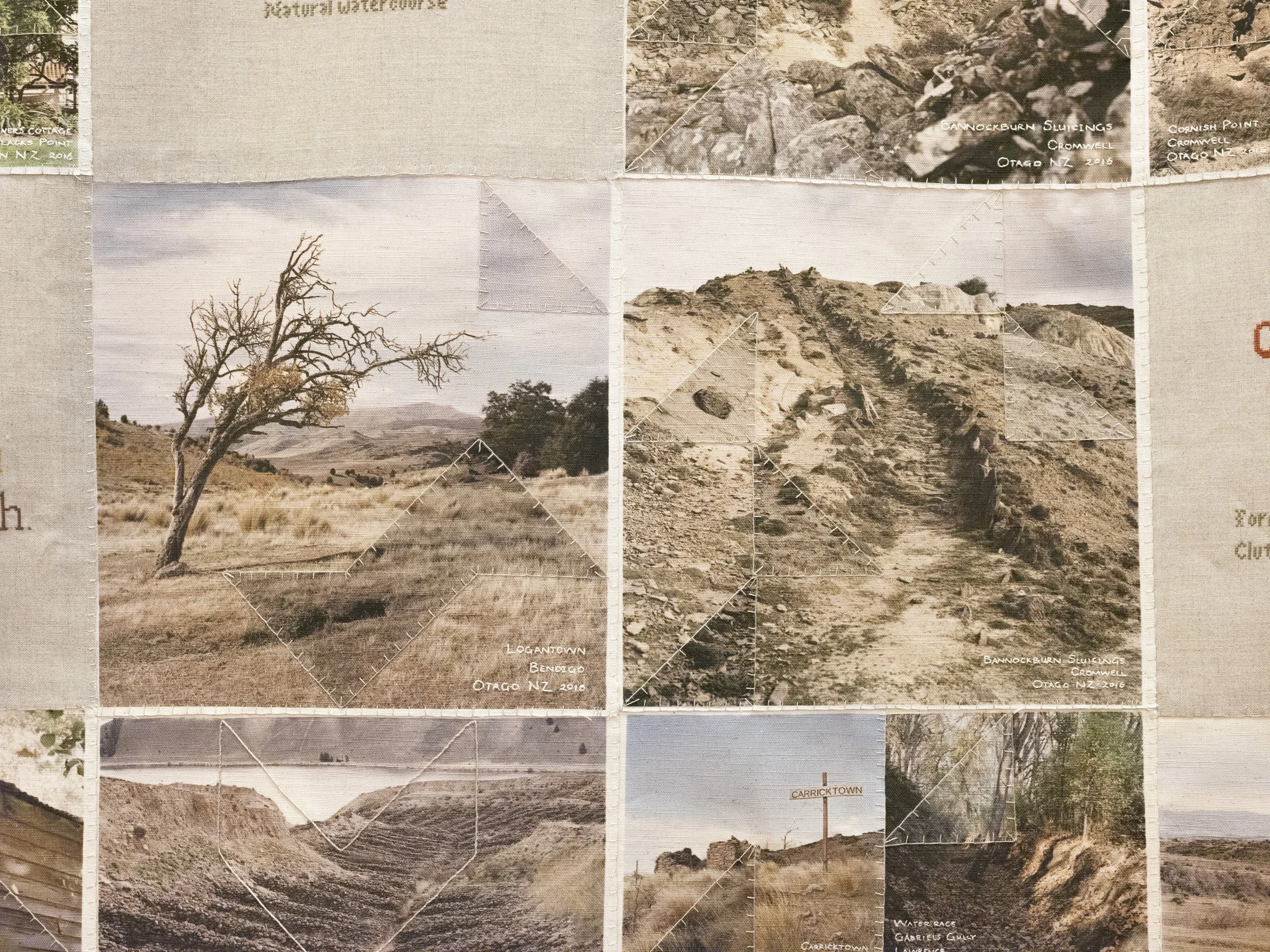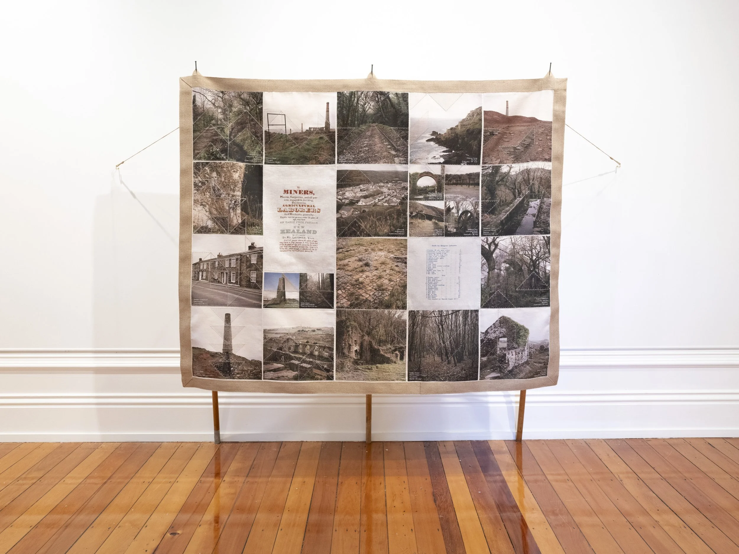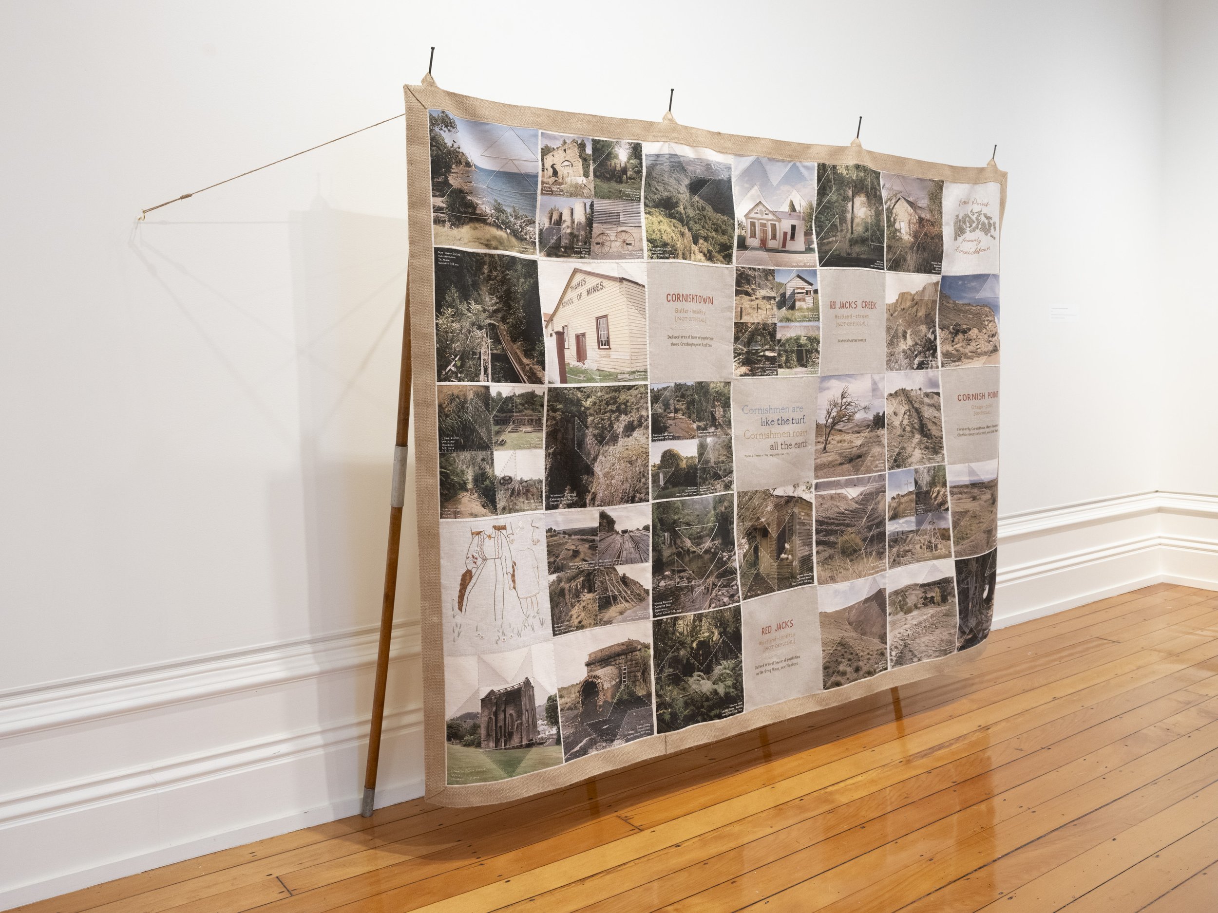 Like the Turf reveals Caroline McQuarrie’s artistic exploration of Pākehā histories of colonial settlement through the examination of a specific set of immigrants in late 19th century Aotearoa New Zealand. Skilled migrants and their families left Cornwall and Southwest Devon’s failing tin mines to join the New Zealand gold rushes or work in underground gold and coal mines. Locations in Aotearoa the miners landed stretched from Kawau Island in the Hauraki Gulf through the Coromandel, the West Coast and into Otago. Conceptually this exhibition examines intergenerational histories and sociologies. Catherine Delahunty has described the post-migratory experience as “the severing from ancestors and from the land that has brought us material advantage and spiritual emptiness. The denial of this condition assists us in our denial of the tangata whenua indigenous reality and justifies our control of resources. But it has required a weird forgetfulness.”[2] Combining photographic imagery, embroidery and textiles to contextualise the lives of these colonial-settlers, Like the Turf weaves the less visible experience of women and families with the legacy of industry left in the landscape. The imagery in Like the Turf has been made on the whenua of Ngāti Waewae, Kāti Māhaki ki Makaawhio and Kāti Huirapa ki Puketeraki (Ngāi Tahu), Ngāti Hauā (Waikato Tainui) and Ngāti Manuhiri.