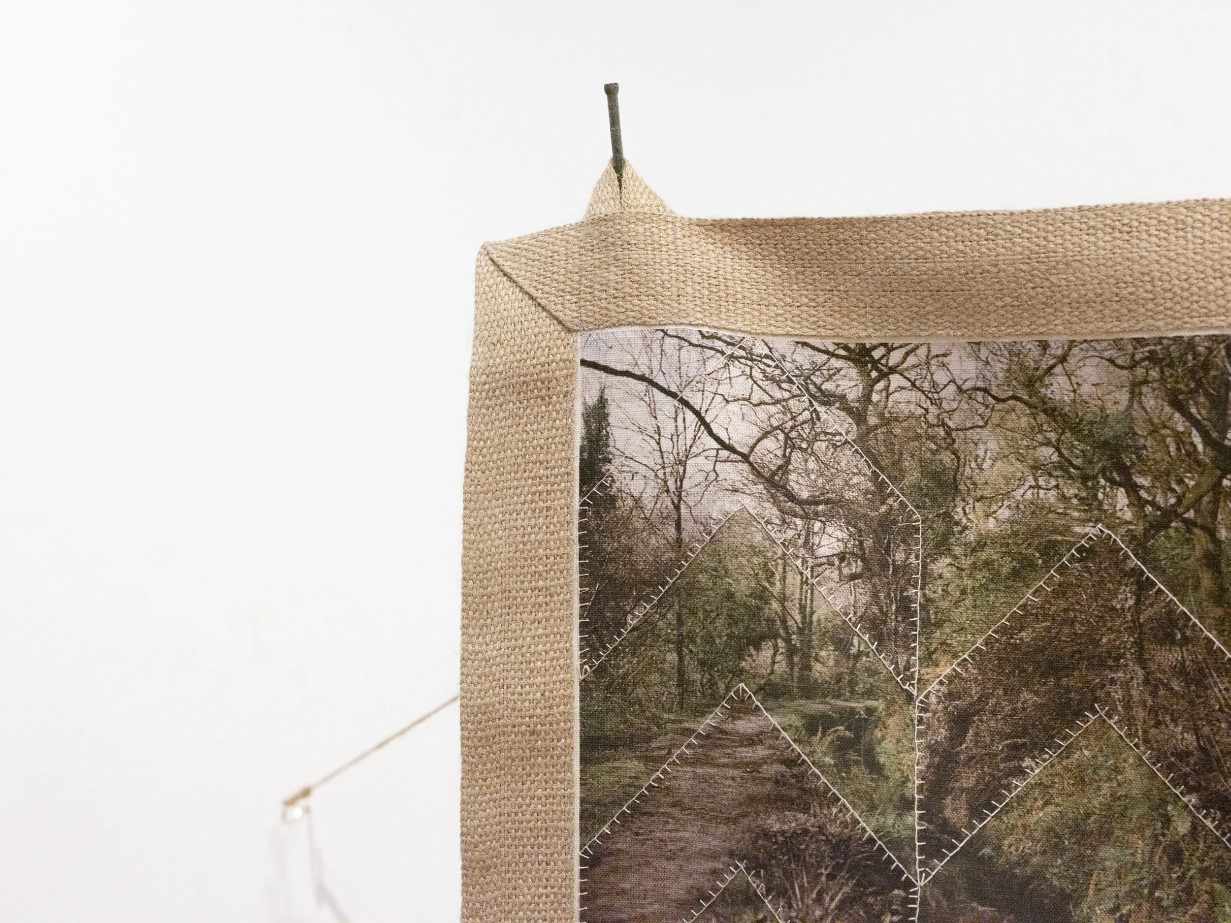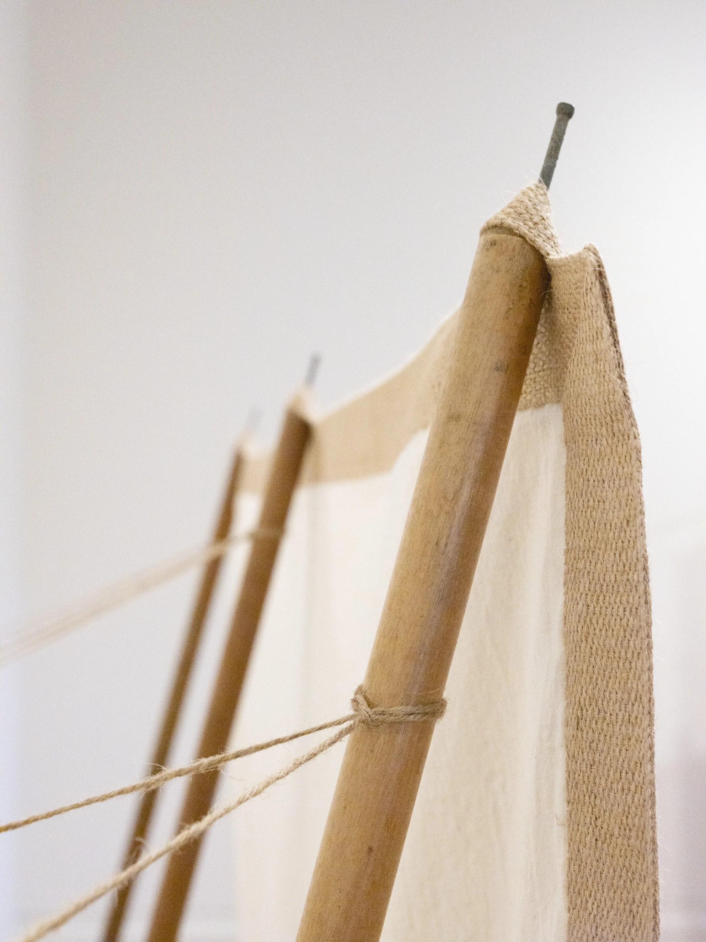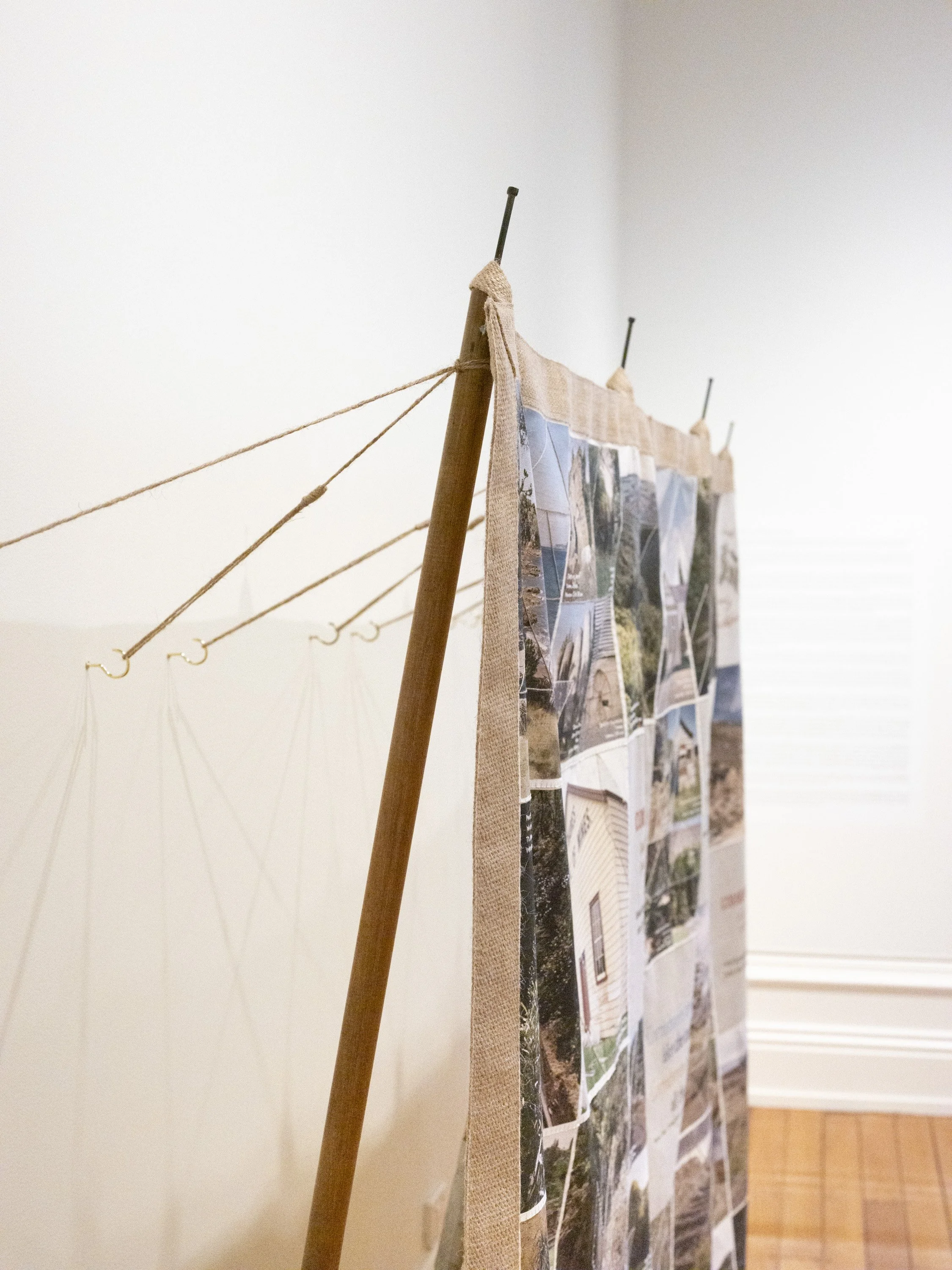 Digitally printed linen, hand embroidered cotton on linen, jute webbing, cotton thread, found poles, jute cord