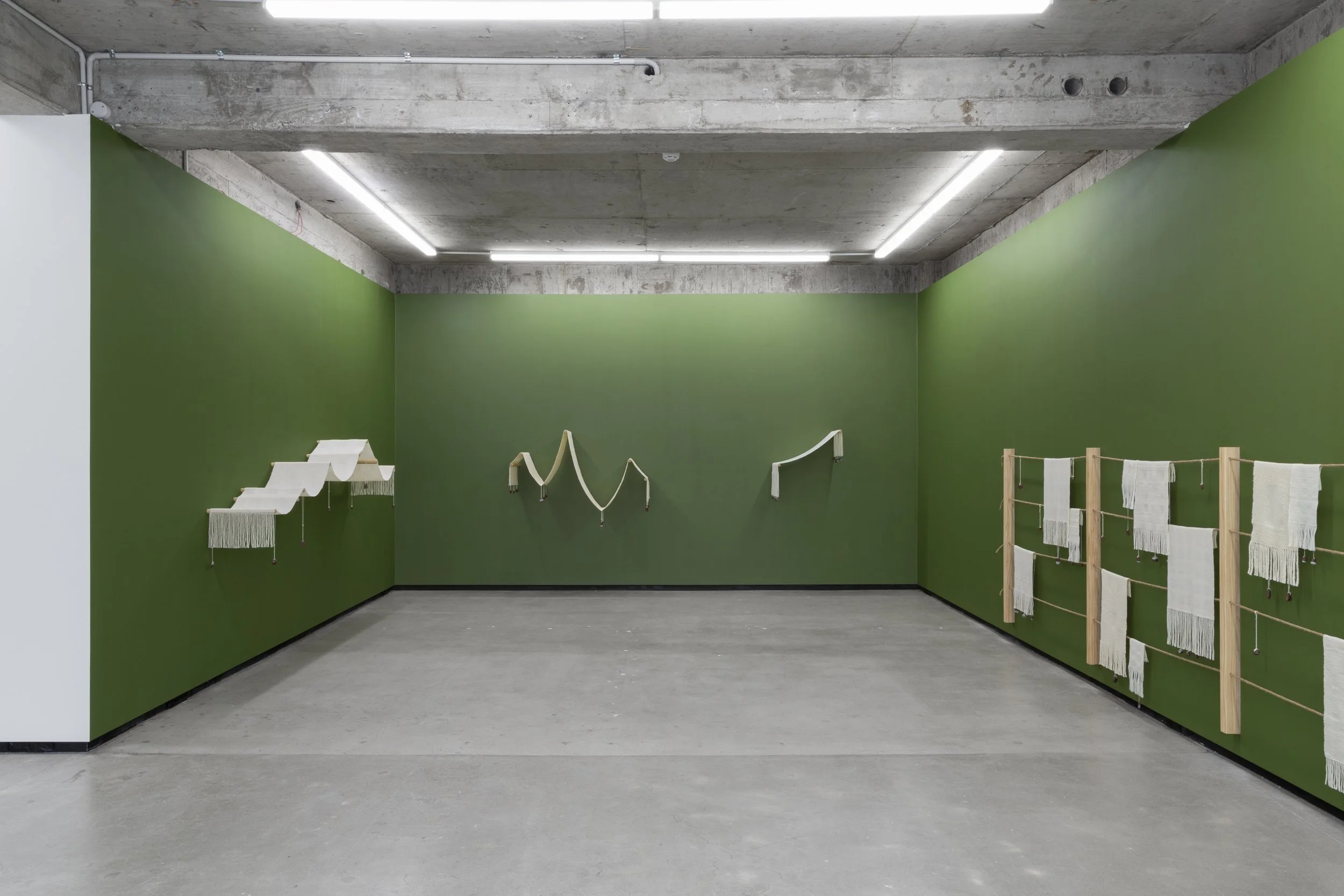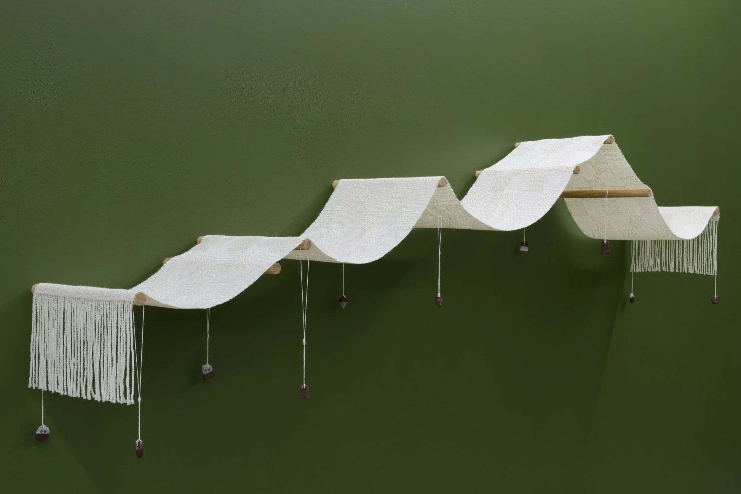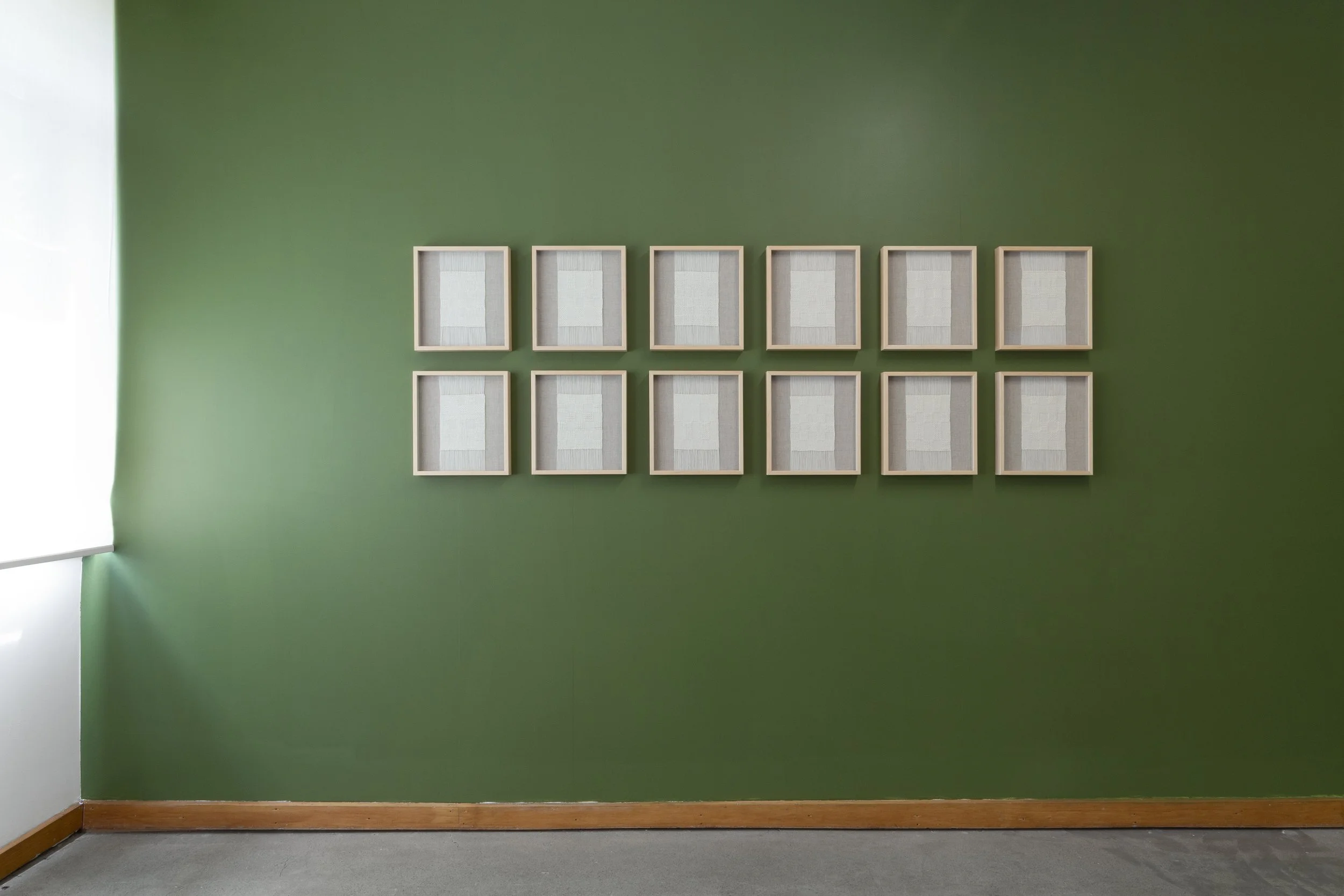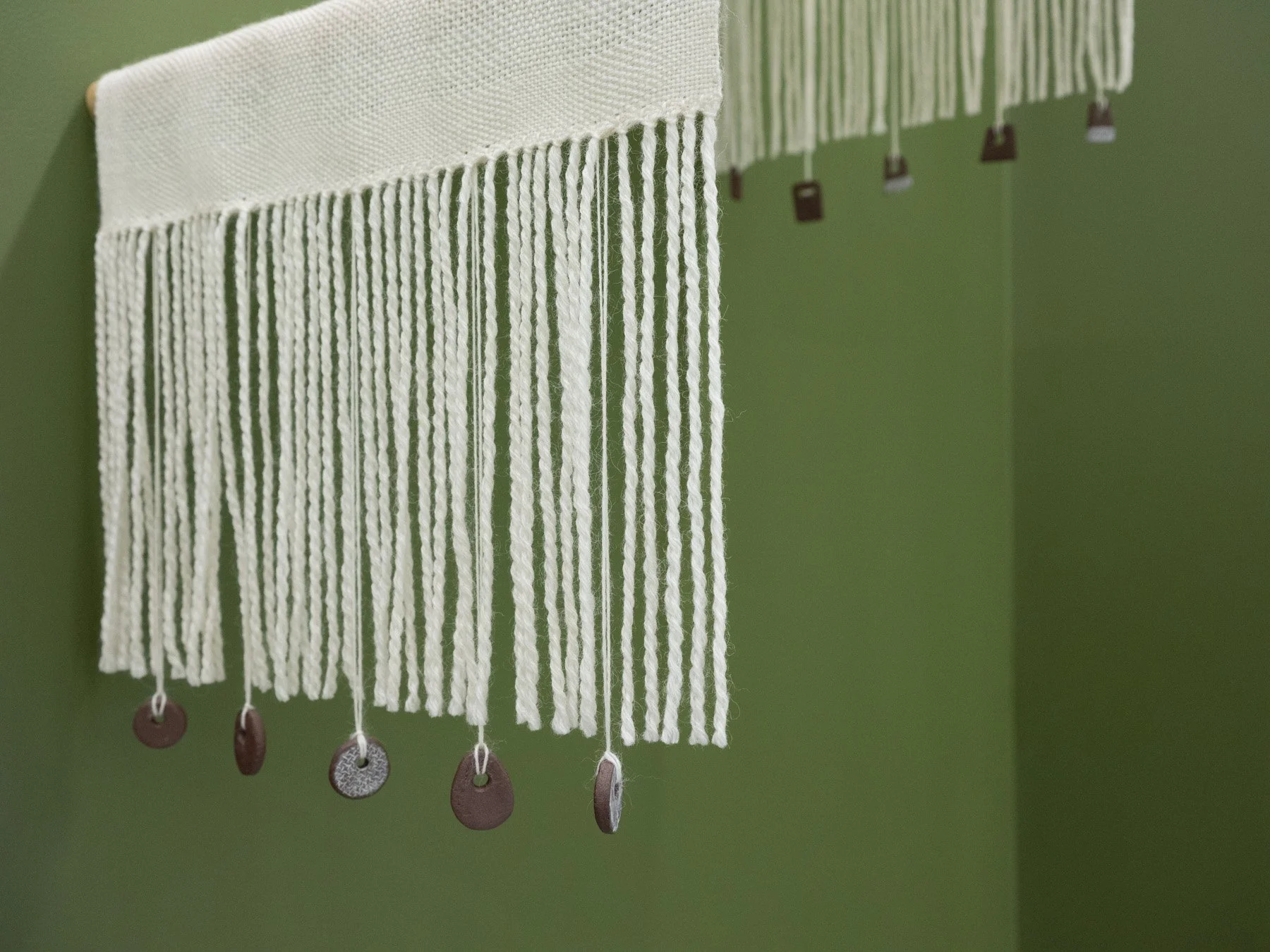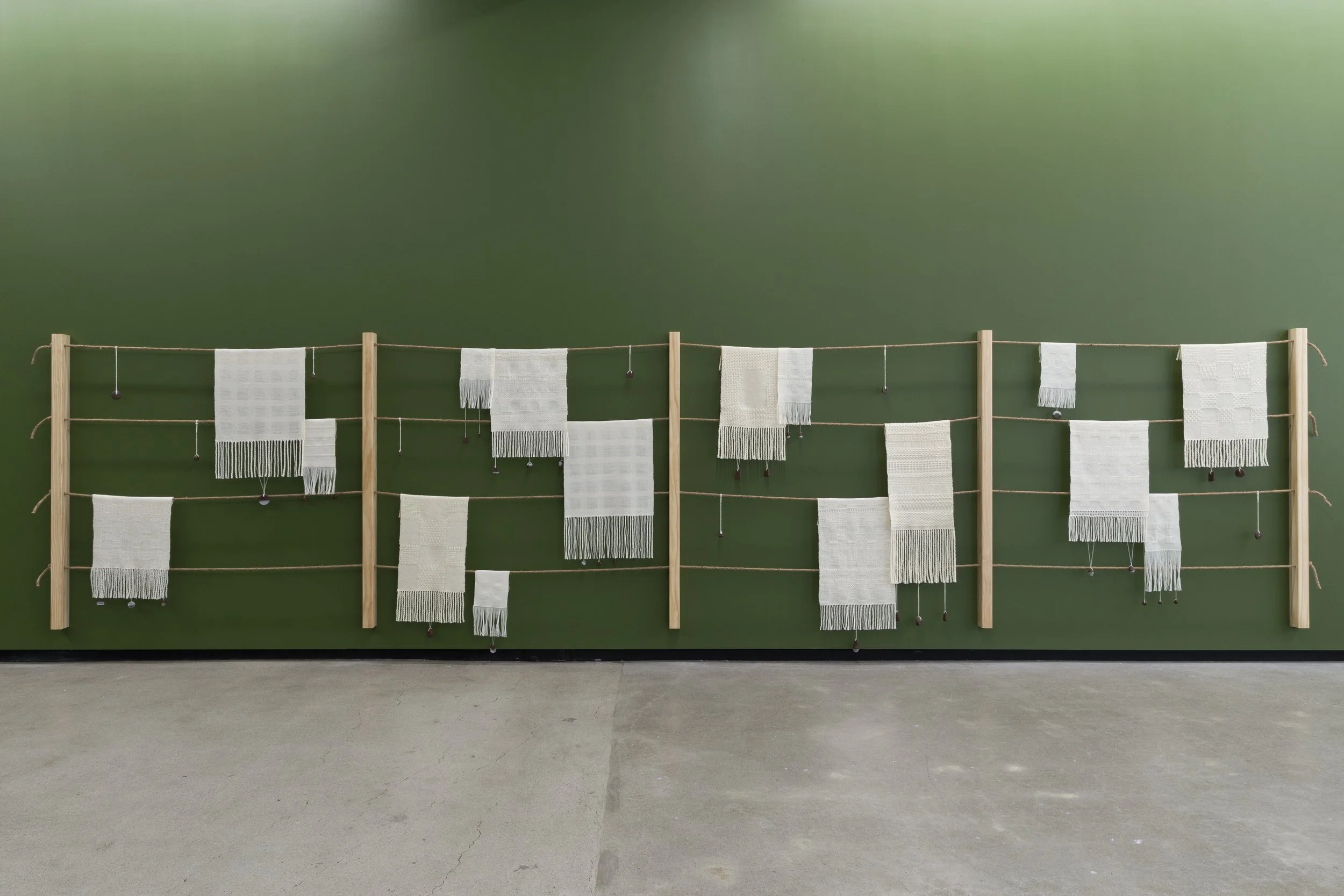How deep into the earth we sink is an exhibition developed from my time at The Gullies Art Residency on a sheep and beef farm in the Rangitīkei in winter 2023. The work explores land use in farming, using undyed Aotearoa-grown wool woven into grid structures emulating pasture as seen from above, in rolling hills and deep gullies where native bush still grows. The woven works are weighted down with pottery weights made from papa clay, a type of clay made from soft, blue-grey mudstone or muddy sandstone common across Aotearoa, seen along the banks of the Rangitīkei river. The different weave textures might suggest differing uses of pasture, while the clay weights ground the lightweight weaving, suggesting a connection deeper into the earth.