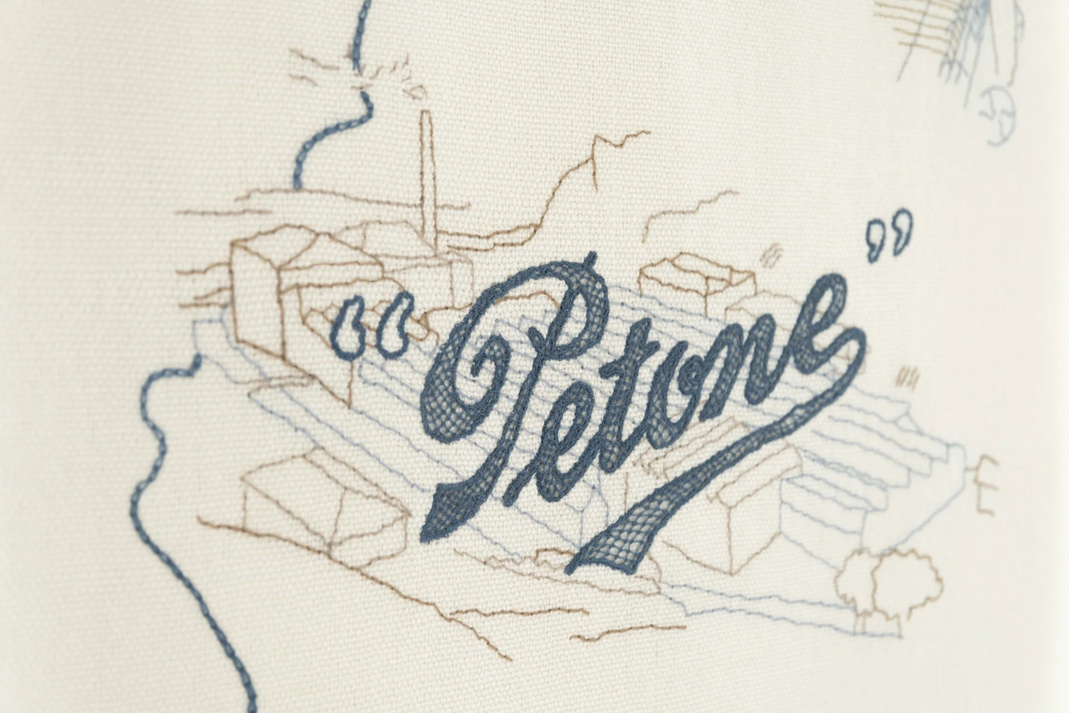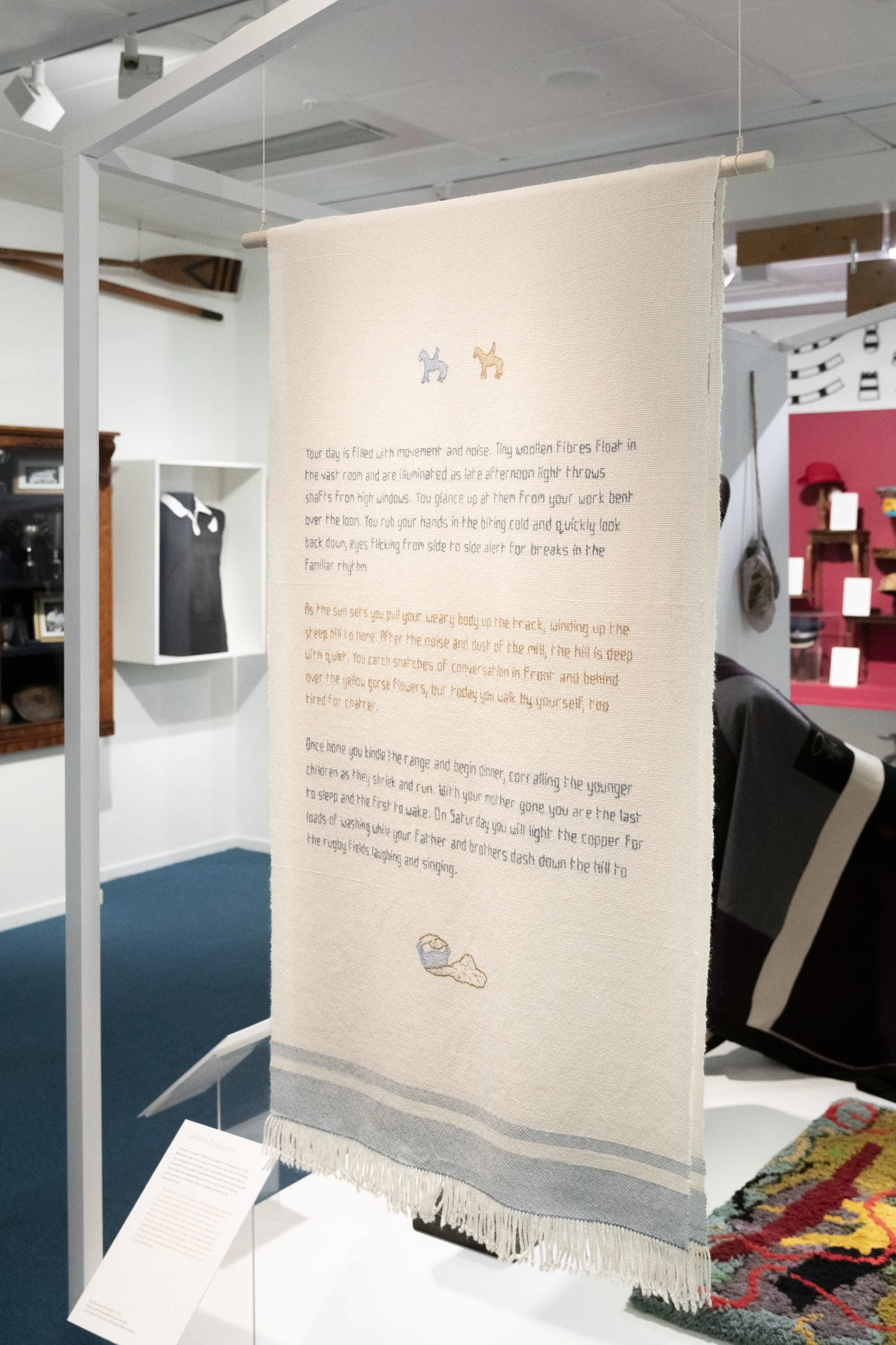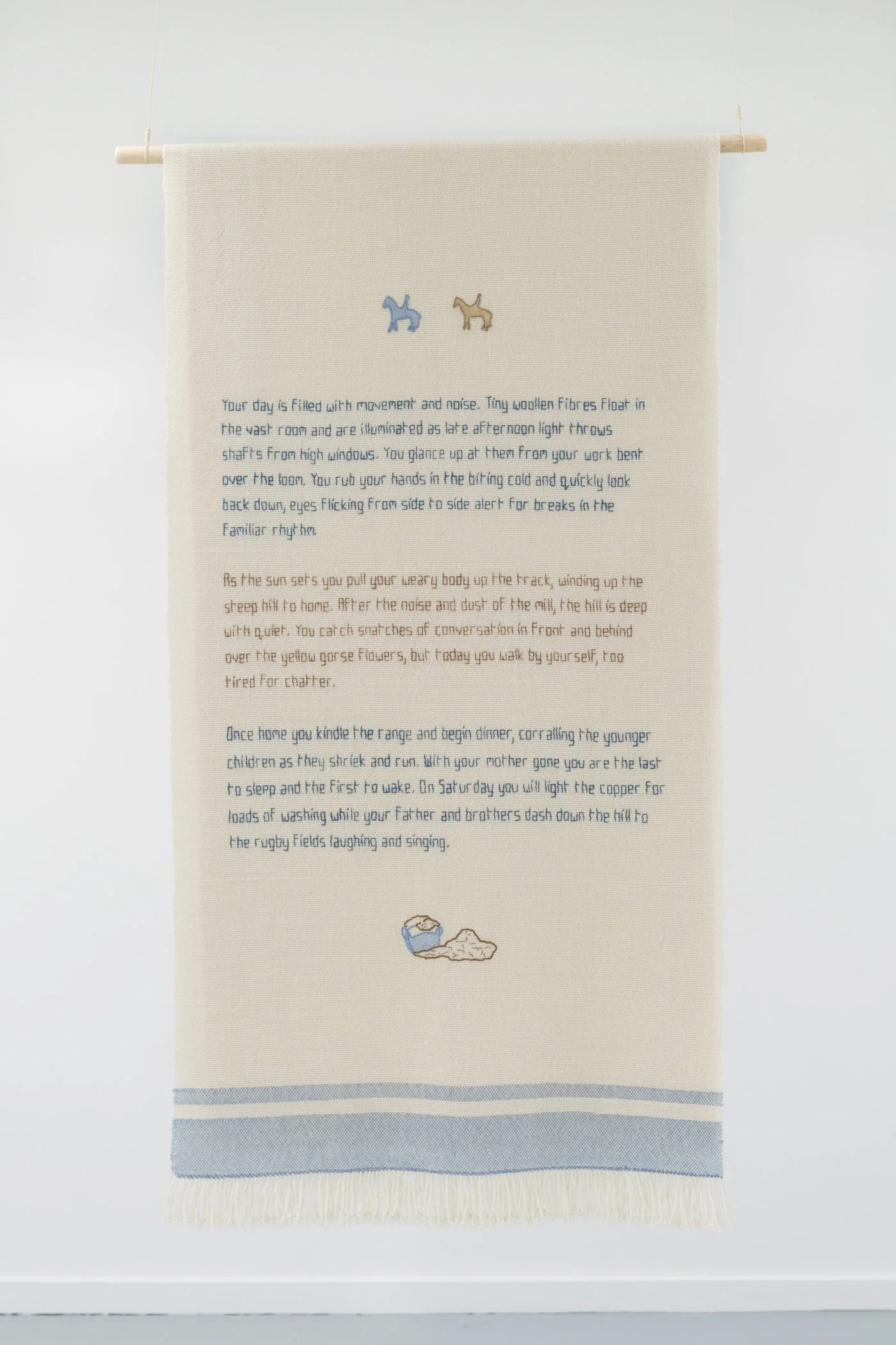 The unwritten history of women’s role in primary industry in Aotearoa in the 20th century is the focus of Woollens and Worsteds. Taking written material and visual imagery from historical research, and an imagined story of a mill worker, Woollens and Worsteds aims to explore the Petone Woollen Mill’s material history. The entire work is created from scratch, with a hand woven wool fabric base embellished with wool embroidery. The front of the work celebrates the public face of the company and the physicality of the mill, while the back imagines a more personal story of a female mill worker.
